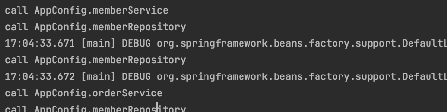 @Bean이 붙은 메서드마다 이미 스프링 빈이 존재하면 존재하는 빈을 반환하고,