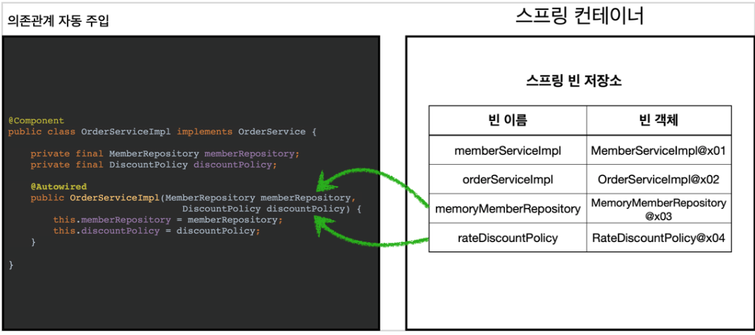 생성자에 @Autowired를 지정하면 스프링 컨테이너가 자동으로 해당 스프링 빈을 찾아서 주입한다.