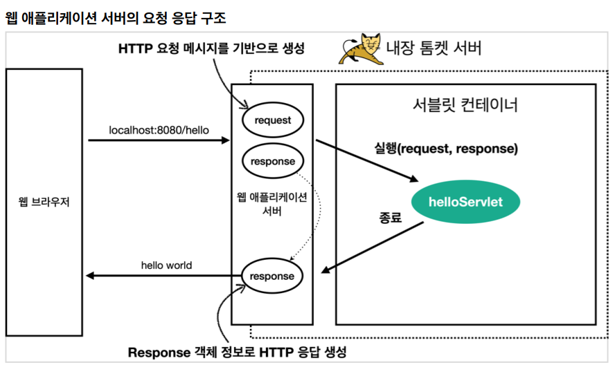 request, response 객체를 만들어서 helloServlet을 호출해준다(Service)