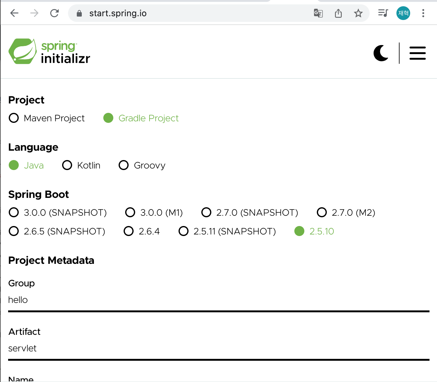 프로젝트를 생성하기위해 start.spring.io에서 옵션들과 dependency를 선택하고