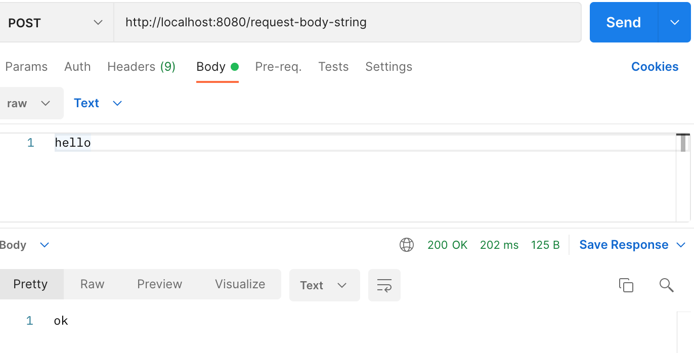 먼저 가장 단순한 텍스트 메시지를 HTTTP 메시지 바디에 담아서 전송해보았다.